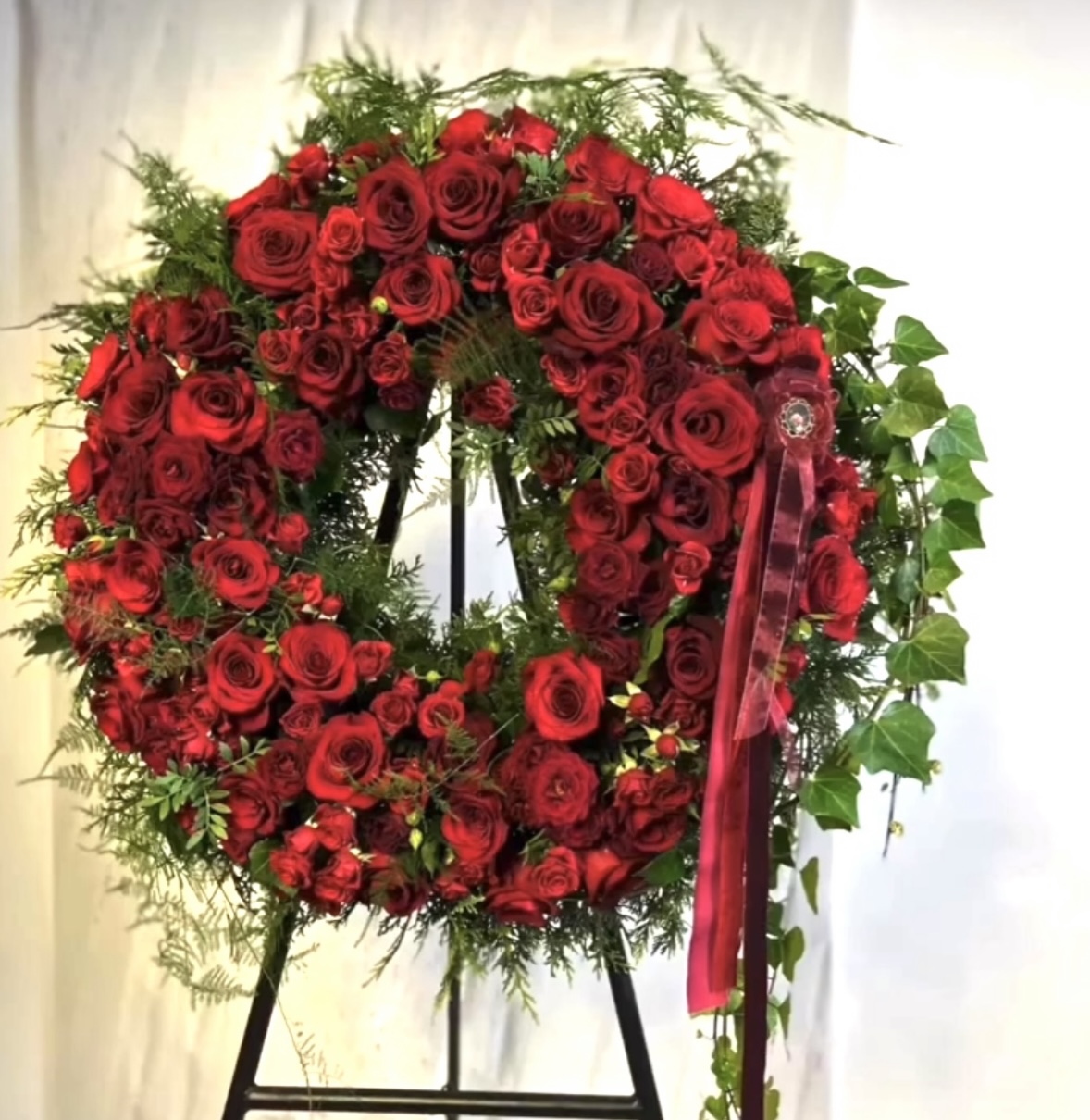 A wreath of beautiful red roses, classic elegance, creates an elegant and loving last word.