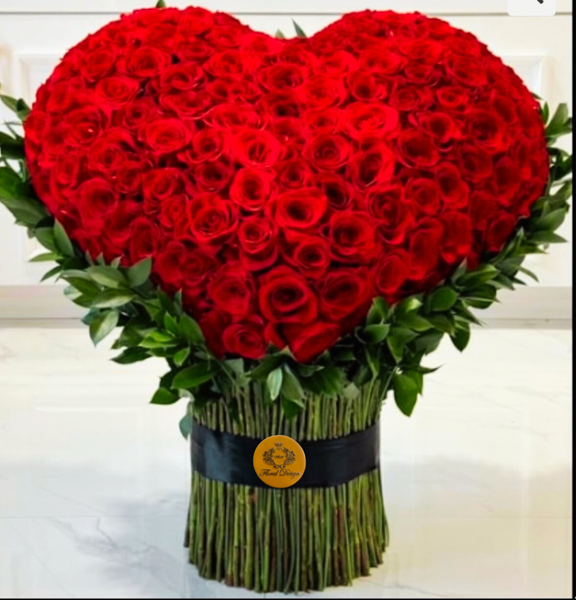 A breathtaking arrangement of premium red roses intricately shaped into a heart, surrounded by lush greenery for a striking contrast. The bouquet is expertly hand-tied with a sleek black ribbon for a sophisticated and timeless look. Perfect for grand romantic gestures, anniversaries, or as a symbol of love and devotion.