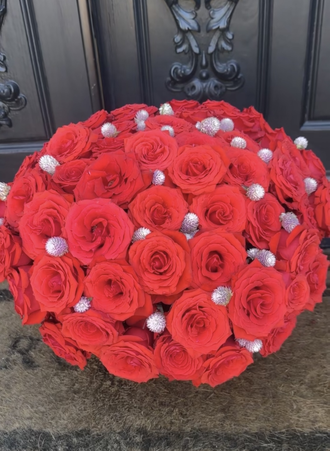 Approximately 150 large red roses arranged in a sleek gold iron vase for a bold, elegant look.