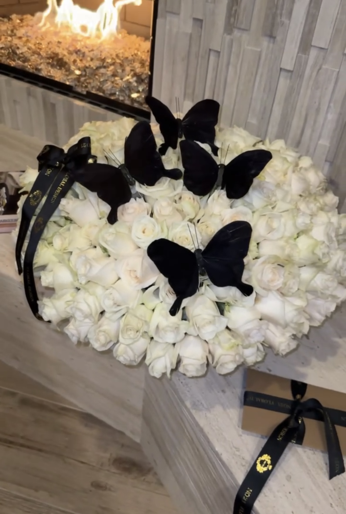 An exceptional arrangement of 200 white roses showcased in a sophisticated ceramic vase, beautifully adorned with black butterflies. This signature design captures timeless elegance and grace, perfect for celebrating meaningful moments and creating lasting impressions.